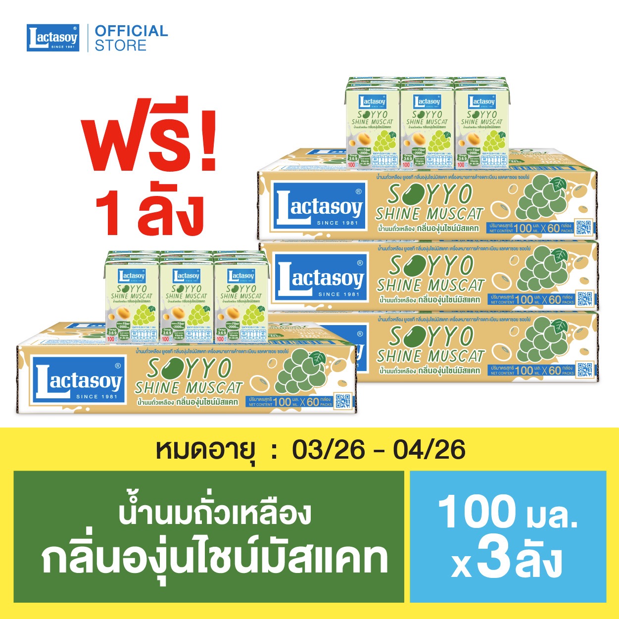 แลคตาซอย ซอยโย่ องุ่นไชน์มัสแคท 100 มล. 3 ลัง แถม 1 ลัง (หมดอายุ 03/26 – 04/26)
